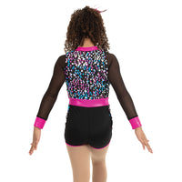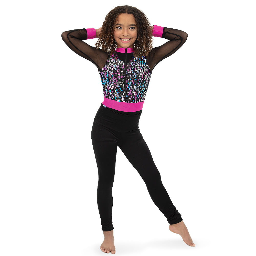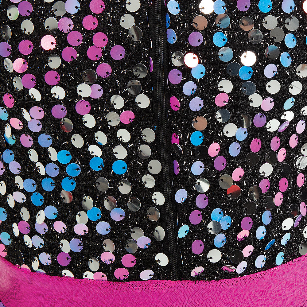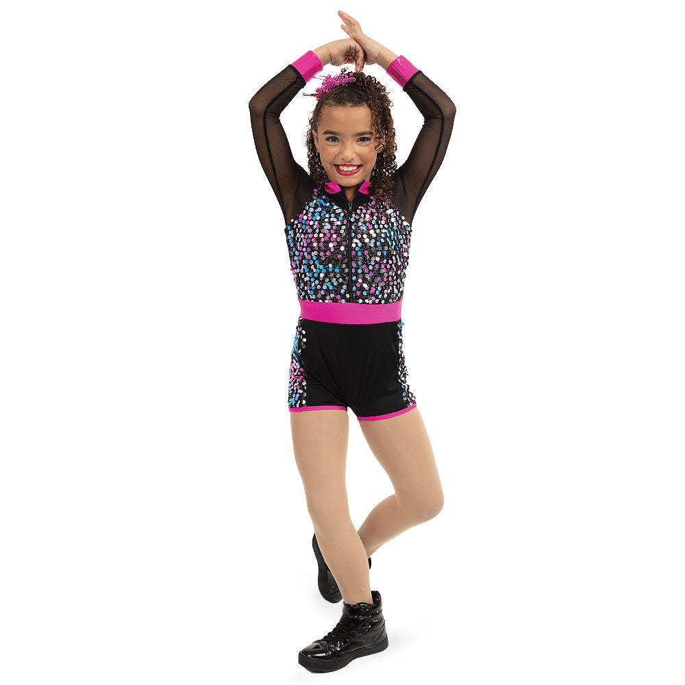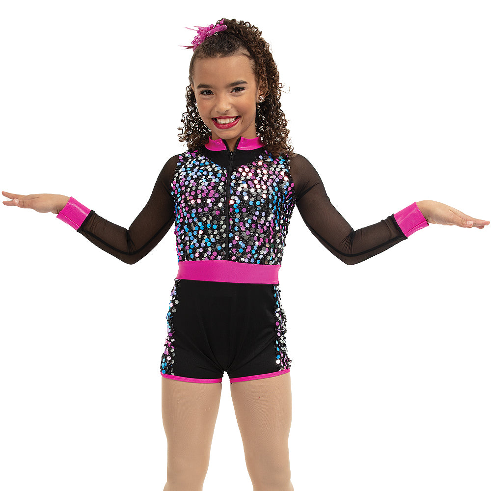 Show off your dance moves in this dynamic biketard. Center front zipper detail with multi color sequin bodice and mesh panel. Long black mesh sleeves with hot pink foil cuffs. Black tricot bottoms are accented with side sequin panels. Hot pink foil neckband. Lined on bodice. Polyester, Spandex.
