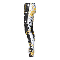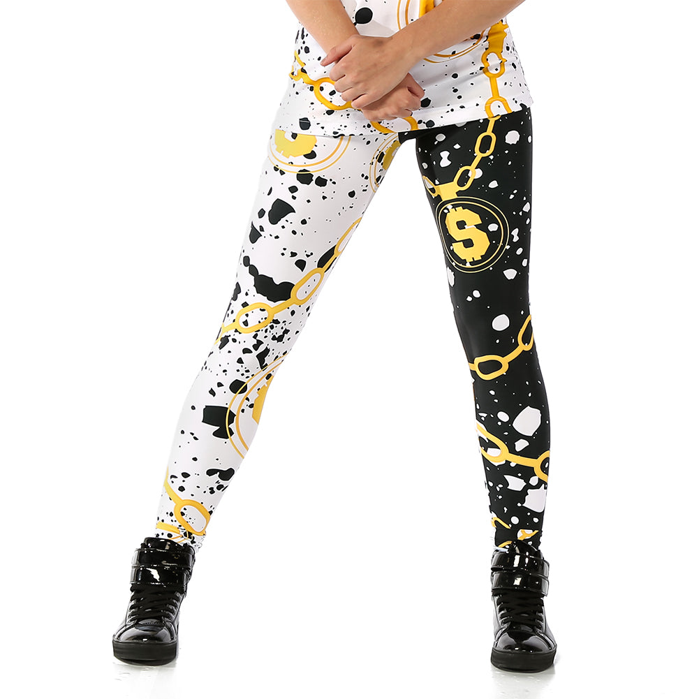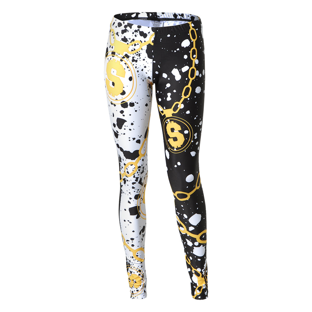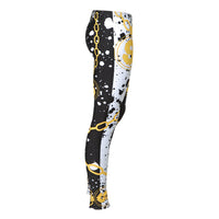 Head-Turning leggings feature a comfortable covered elastic waistband, and an all-over chain, money, and abstract ink splatter design.