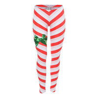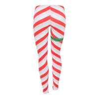 Dress up this holiday season in these candy cane inspired leggings. Perfect for any Christmas or Holiday performance, these leggings are complete with a green Holiday bow. Elastic waistband. Polyester, Spandex.