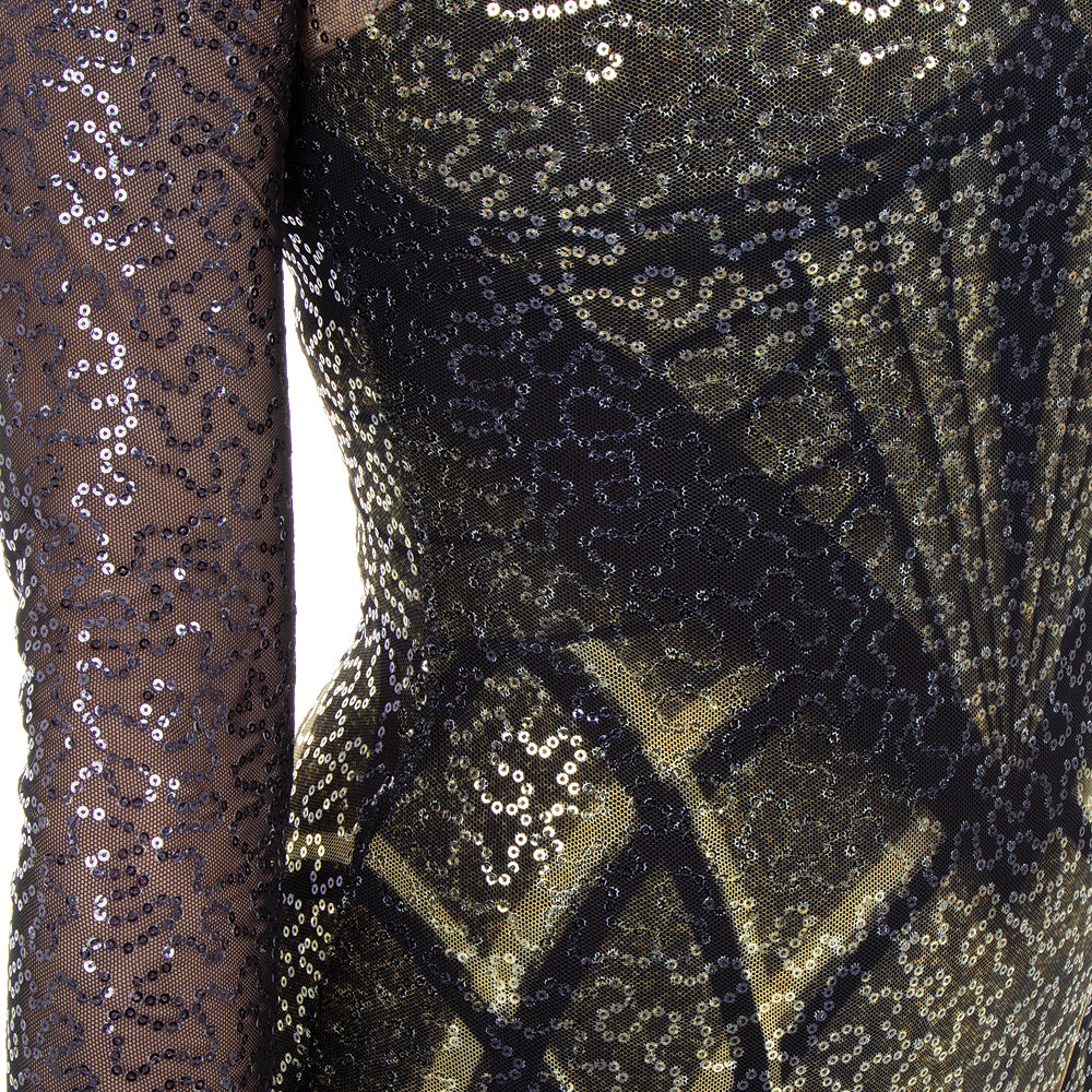 Make the stage Light Up and Glow in this stunning and romantic sequin mesh leotard. This unique long sleeve leotard is designed on power stretch mesh for the ultimate fit and a dynamic look with our intricate dye sublimation graphics. Binding along neckline and leg opening for comfort. Center back zipper. Stretch Mesh. Polyester, Spandex.