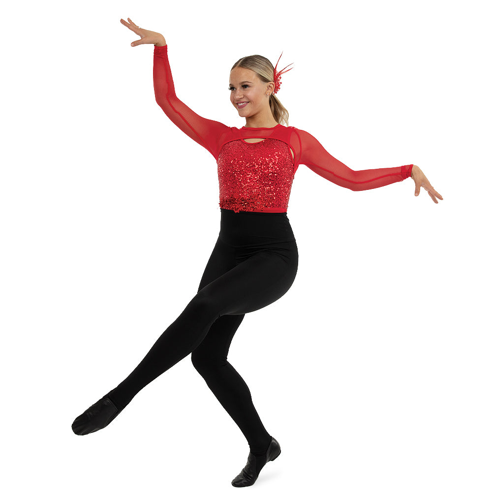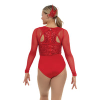 Take a journey as you dance in this romantic leotard. This unique costume starts with a foundation sequin tricot leotard then an overlay mesh shrug creating an illusion neckline. The back features a racer back for hidden straps and the continuum of the mesh shrug. Long mesh sleeves and accented applique at waistline. The matching mesh skirt is perfect for your next contemporary or lyrical performance. Nylon, Spandex.