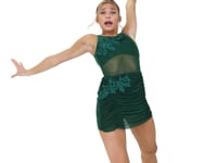This gorgeous lyrical dress includes an upper tricot scoop neckline panel and a midriff mesh panel that is paired with a shirred detail mesh skirt. The final touches of the gorgeous appliques pull this lyrical dress together. Leotard tricot bottoms.