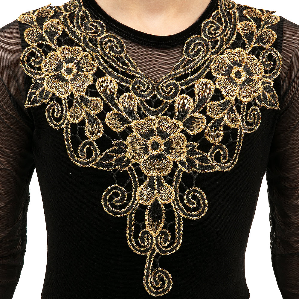 Biketard featuring a soft stretch velvet accented with a metallic floral applique. Featuring an upper front and back black power mesh panels that are tricot lined. The long mesh sleeves are accented with metallic foil appliques for the perfect detail. Lined. Nylon, Spandex.