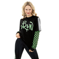 This shirt features a 2-1 short sleeve layered over a long sleeve and a neon lime green and black checkered pattern for the perfect look. “Crew” on the front bodice, white stripes on the sleeve.