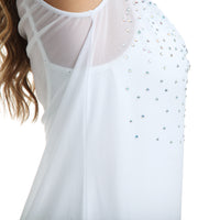 This sleeveless mesh overdress is a minimalistic silhouette but with the addition of the rhinestone waterfall design, it adds just the right amount of sparkle and is the perfect dress for your next lyrical or contemporary performance. Round neckline. AB rhinestone for extra shimmer.  Polyester.