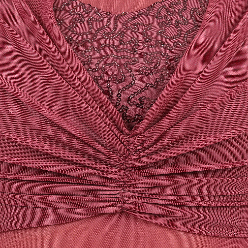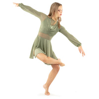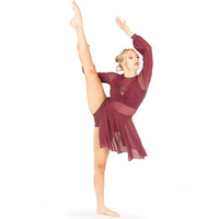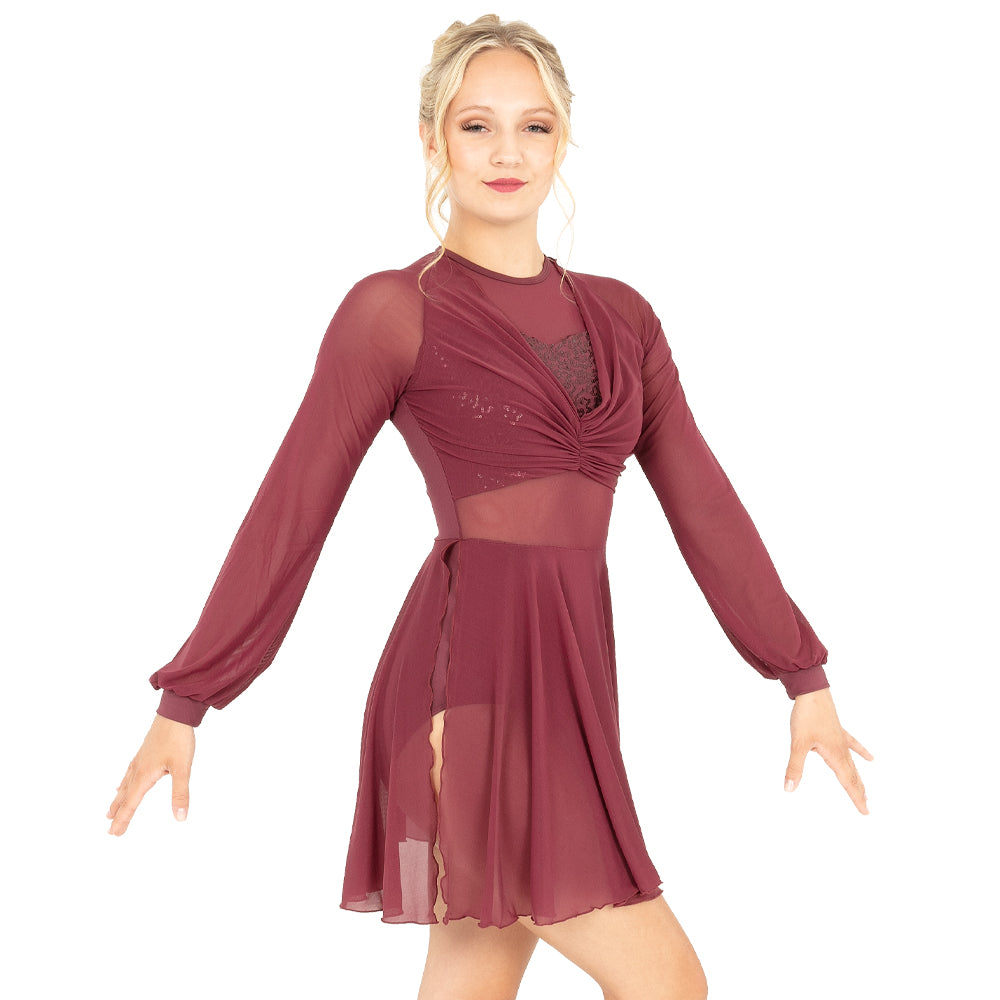 This gorgeous long billowed sleeve lyrical dress features a gathered mesh overlay panel, with a sequin and mesh sweetheart bodice and a flowy mesh skirt with side slit. An illusion midriff panel is not lined. Circle neckline, lined front and back, center back zipper closure.
