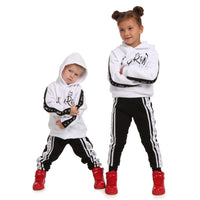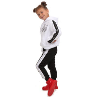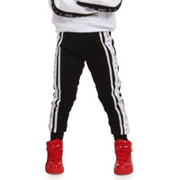 Jogger with an elastic enclosed waistband, ribbed waistband and cuffs, white side leg panel with screen print artwork.
