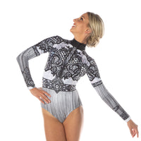 Steal the show with this modern romantic leotard. Featuring a dye sublimated realistic lace applique design and an unique deco abstract ombre line design that creates a very slimming silhouette. This is a must-have one of a kind print that is both dynamic and romantic and will look great on all sizes. Fully lined, mock neckband, center back zipper closure. Polyester, Spandex.