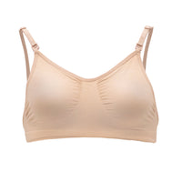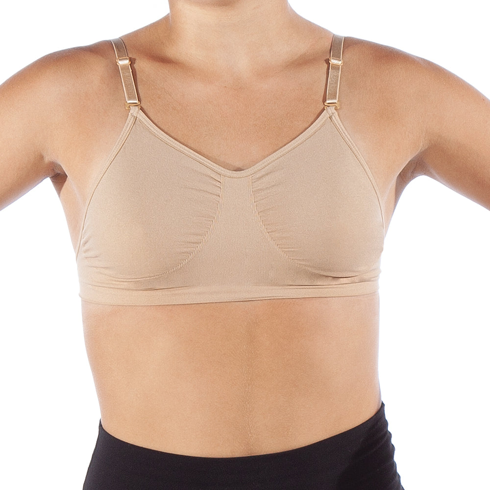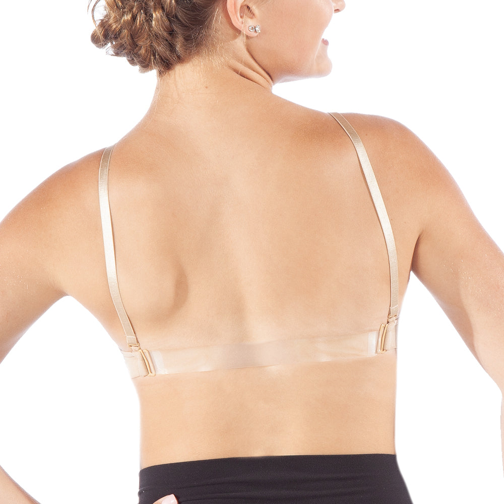 This seamless knit bra is the perfect undergarment. The bra features a clear 1-inch width back strap, clear and nude adjustable straps. With the adjustable straps, you can wear this bra multiple ways. The fabric has a smooth and silky hand feel while having moisture-wicking properties so you feel comfortable during any performance.