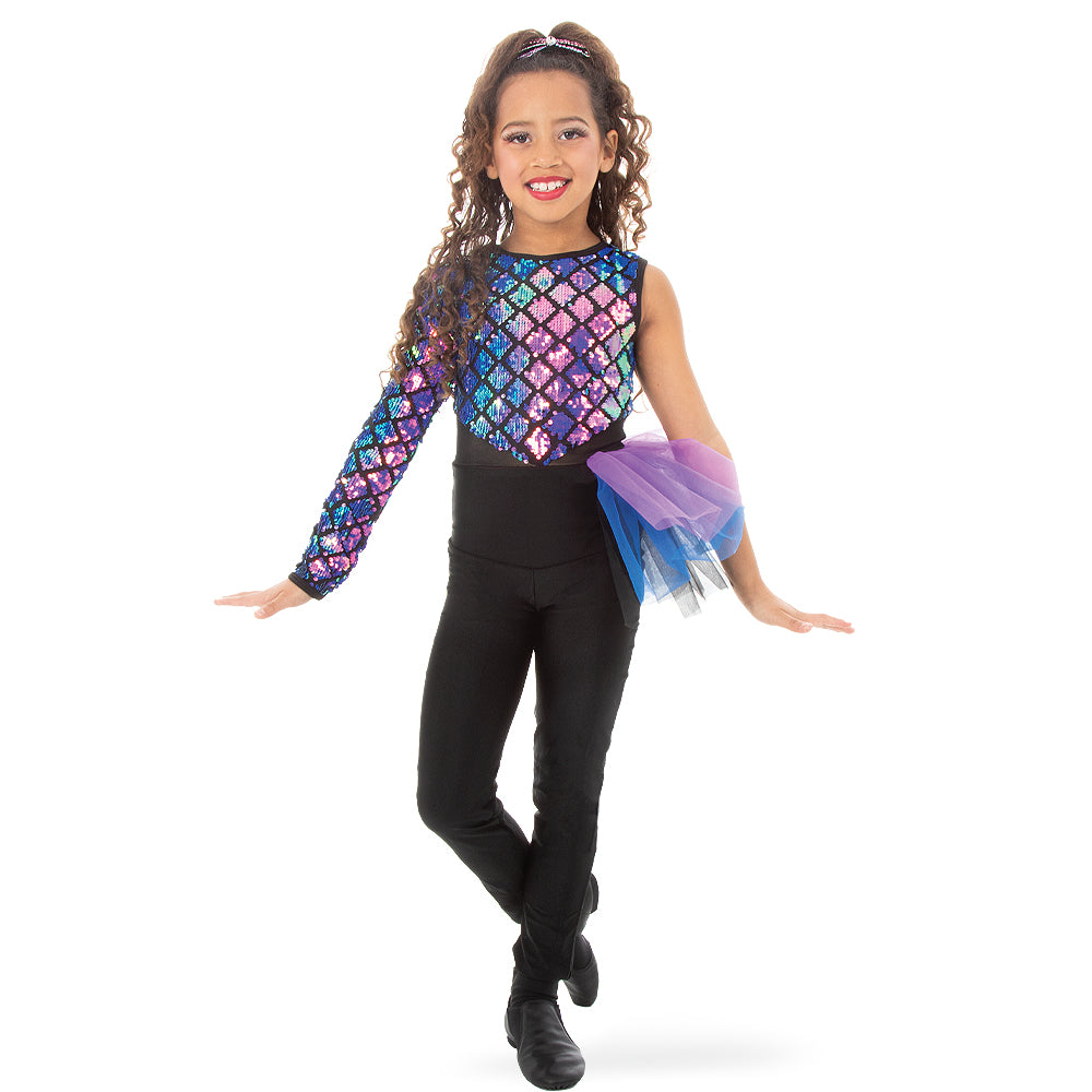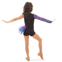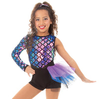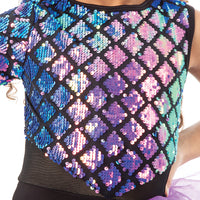 Stand out on stage in this unique iridescent diamond pattern sequin biketard. Featuring one sequin long sleeve lined with tricot for comfort, illusion mesh cut out panels and accented with a side bustle for extra detail. Fully lined, black tricot back and shorts. Center back zipper closure.