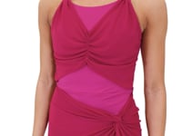 This scoop neck lyrical dress includes a tricot foundation leotard with a center front gathered detail mesh bodice overlay, a mesh knotted skirt, and spaghetti adjustable straps.
