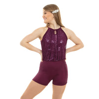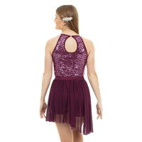 Sparkling biketard featuring a high neck sequin tricot bodice with a keyhole, a gathered overlay mesh panel. Sequin tricot back bodice with keyhole and g-hook closure. Binding around armhole and neckline for comfort. Nylon, Spandex.