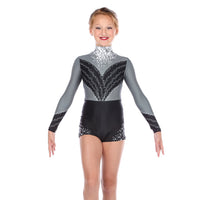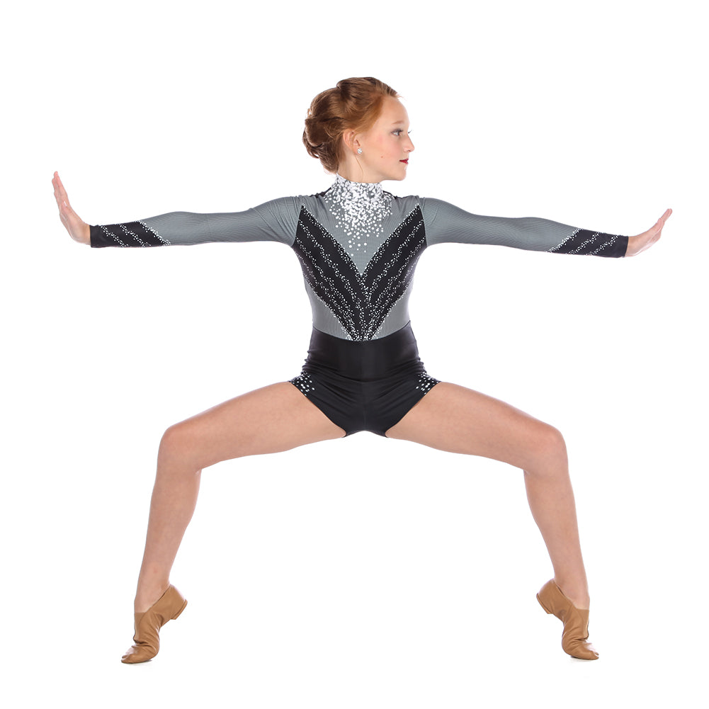 So stunning, this long-sleeve Mock-Neck biketard will have everyone's attention. Zip-Up back. Polyester, Spandex. (Rhinestones Sold Separately)