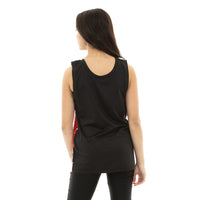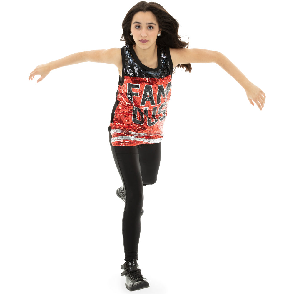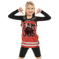 You're famous so let everyone know it in this sequin basketball jersey. ‘Famous’ with varsity stripes at the hem, a dropped armhole tank, black jersey knit back and a ribbed collar.