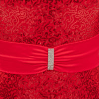 Be fancy and add extra glam to your next routine. The striking red sequin color of the leotard, with the gathered waistband is accented with a rhinestone trim pull this leotard toether. The gorgeous ruffe sleeves add just the right amount of drama. The back has a lined mesh panel. Centerback zipper closure. Binding along the leg opening for comfort.