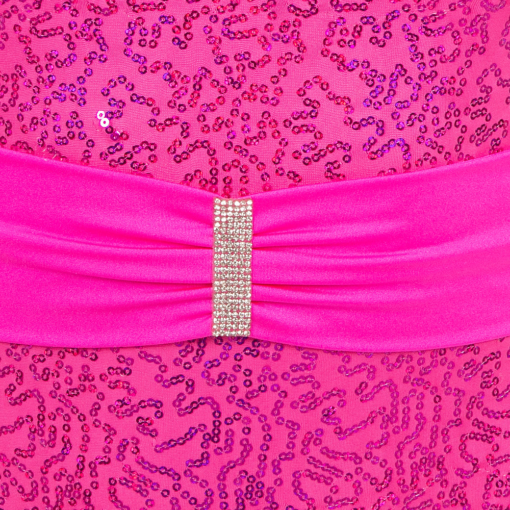 Be fancy and add extra glam to your next routine. The striking vibrant sequin color of the leotard, with the gathered waistband is accented with a rhinestone trim pull this leotard together. The gorgeous ruffle sleeves add just the right amount of drama. The back has a lined mesh panel. Center back zipper closure. Binding along the leg opening for comfort.